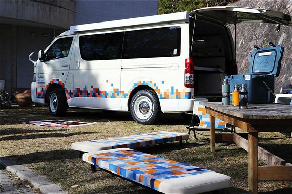 学生たちが考案した車両のコンセプトは、「遊び心」をキーワードに、老若男女問わずキャンピングカーを楽しめる車両。とくに従来キャンピングカーのメインユーザーではない女性も意識したという外観には、青やオレンジで構成されたポップなグラフィックを採用している。