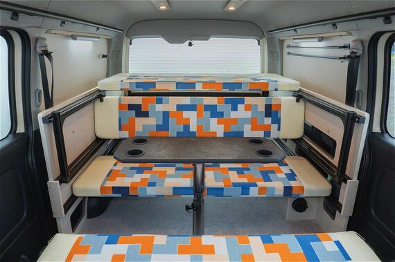 さらに、レクビィが実用新案を持つオリジナルの「フロントダイネットマット」も装着(オプション)。これは、運転席と助手席の背もたれを倒して装着するソファ。前向きにした2列目シートとの間に着脱式のテーブルを設置すれば、対面式のダイネットにすることができる。ほかにも、室内の右側後方にはコンパクトなキッチンも搭載。付属するスルータイプのシャワーヘッドは、リアゲートを開ければ車外での水利用も可能だ。