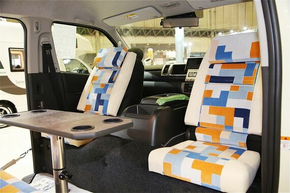 アコロでは、そうしたベース車両の基本装備を継承しつつ、シート生地をオリジナルに変更し、前出のグラフィックを施している。また、映像が映し出せるプロジェクターとスクリーンも採用。学生たちによれば「映画館のようにしたい」といったアイデアを採り入れたものだ。また、付属のベッドマットやテーブルは、車外にセットすることで、晴れた日に大自然をより堪能できる工夫も施している。