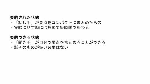 「要約された状態」とは、「話し手」が要点をまとめたもので、話すのにかかる時間も短いです。一方で「要約できる状態」とは、必ずしもかかる時間が短いわけではなく、「聞き手」が自分でまとめることができるのです。