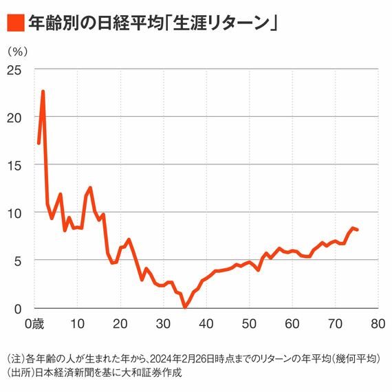 株価が上昇したことで、「生涯で株価が下落」という世代は理論上いなくなった。年齢ごとの日経平均株価の生涯リターン(生まれた年から直近までのリターンの年平均)をみると、20歳以下の生涯リターンは高度経済成長期を経験した高齢者よりも高くなっている。