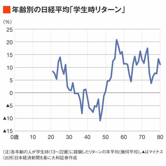 なお、学生時リターン(13歳から22歳までのリターンの年平均)を比較すると高齢者に軍配が上がるが、最近の若者のリターンも悪くない。