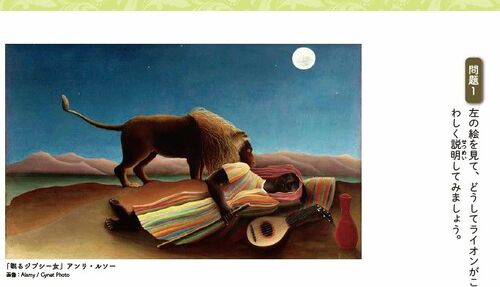 例えば、こちらは19世紀末から20世紀初頭にかけて活躍したフランスの素朴派の画家、アンリ・ルソーの「眠るジプシー女」という作品。草一本生えない不毛な砂漠で、月明かりの中、1匹のライオンが疲れ果てて眠るジプシー女に近づいている絵です。教室では、子どもたちにこの絵をじっくりと鑑賞してもらい、どうしてライオンが女性に襲いかからないのか? その理由を想像して説明文を書く、という課題に取り組んでもらいます。