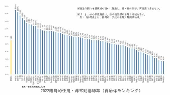 非正規率の高い自治体ほど、教員不足、欠員が生じるリスクも高いということになる(ただし、率の低い東京都などでも近年は年度途中の補充がままならない事態が起きている)。