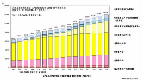 そんな中、「ゆとりある教育を求め全国の教育条件を調べる会」は毎年情報公開請求をしてデータを入手、整理している。下のグラフのとおり、ここ15年あまり、公立小中学校での非正規教員は増え続けている。2022年度は教員数の約18%を非正規雇用が占めている。