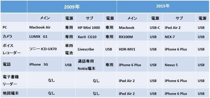 もうひとつ、機器の変化によって生まれたのが、「電源の軽量化」だ。以前は、2つ持つとそれだけ電源が増えた。特にPCとデジカメの電源は負担だった。