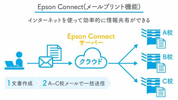 すでに「Epson Connect」を活用し、学校現場の課題を解決している教育委員会もある。彦根市教育委員会では、教育委員会および市内の小・中学校24校の校長室と事務室のエプソンプリンターで「Epson Connect」を使用している。非常時に「メールプリント機能」を活用し、彦根市教育委員会から送信したメールが、各学校のエプソンプリンターから直接印刷できるよう仕組み化している。