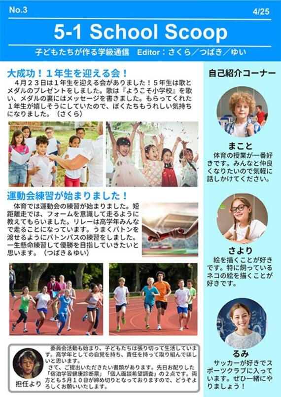 そうした視点で、「学級通信」も見直した。時短だけを考えるなら学級通信を廃止するという選択肢もあるが、日野氏は子どもたちと協働で作成するスタイルに変えたのだ。