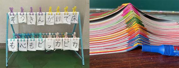 日々の学級活動における効率化についても、さまざまな工夫をしている。例えば、子どもたちが整理整頓をしたくなるよう、雑巾は片付けたときに文章になるよう文字を書き、定位置をわかりやすくした。宿題は、出席番号の「〇番~〇番は青」など5色に色分けして提出する順番を決め、日野氏が毎朝教室に来たときには全員のノートが提出済みであるようルール化している。