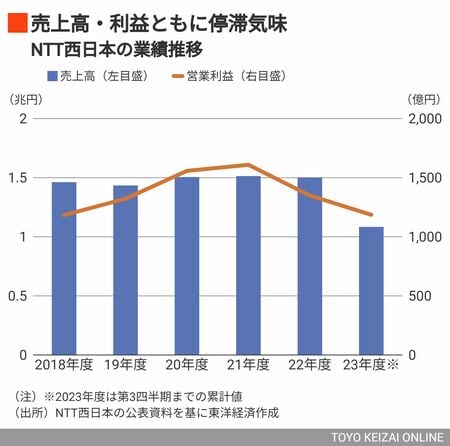 確かに結果として、数字は出ていない。2022年度の業績については、電気料金高騰や通信設備の故障などが打撃となったうえ、固定電話の落ち込みが相当厳しかった。電話だけで毎年、利益が200億円以上も落ちている(編集注・NTT西の2022年度の売上高は1兆5016億円、営業利益は1349億円)。