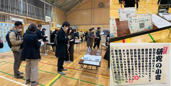 体育館内にはBGMが流れ、教職員が生けたというミニフラワーアレンジメントが置かれたテーブルには、各研究グループの紀要を読み取るQRコード、児童の学習記録などが展示。お茶とお菓子のコーナーも設置され、参観者は和やかな雰囲気の中で展示を見たり、交流を楽しんだりすることができる。