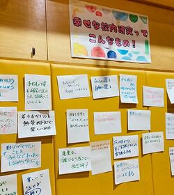 ここは、蕨市立北小学校の体育館。同校の教職員が3年にわたって取り組んできた研究発表会「北フェス」のメイン会場だ。入り口には「皆さんが思う『幸せな校内研究』ってなんですか?」と問いかけるボードが設置されている。記入された回答は会場の一角に掲示され、参観者同士で共有できるようになっている。