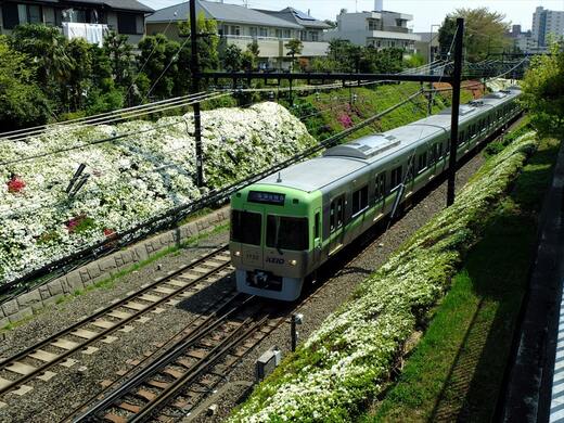 浜田山駅からは勾配区間が続き、高井戸駅は高架上の駅である。ホームからは高井戸寄りに桜並木が見え、電車はさながら桜花爛漫の中から飛び出してくるようだ。また、高井戸―富士見ヶ丘間の線路沿いの切通しの崖線にはツツジが植えられており、アジサイとはまた異なった風情を感ずる。