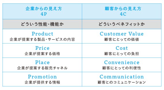 この考え方自体は正しいのだが、大切なのは、それが顧客にどう見えているかである。企業はProductを提案しているつもりだが、顧客が見ているのはCustomer Value:自分にとっての価値である。企業はPriceを提案しているつもりだが、顧客はCost:負担で見ている。企業はPlaceを決めているつもりだが、顧客はそれをConvenience:利便性で評価している。企業はPromotion:情報提供をしているつもりだが、顧客はそれを企業とのCommunication:対話だとみる。