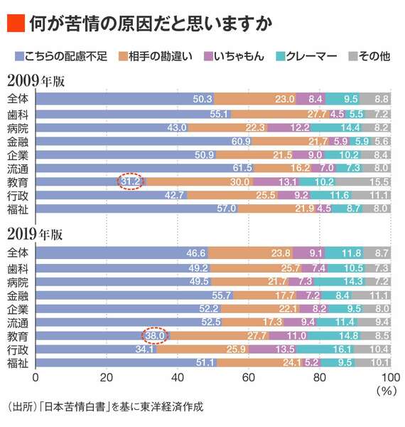 その中の「何が苦情の原因だと思いますか」という問いに対し、2009年版では「こちらの配慮不足」と回答した人の数が、8業種のうち「教育」が最下位だった。2019年版では、最下位は「行政」となったが、教育はそれに続き下から2番目。また、「いちゃもん」「クレーマー」を苦情の原因として回答した数も、行政が1番目、教育が2番目に多かった。つまり、ほかの業界に比べ、相手に非があると捉える傾向が高いのだ。