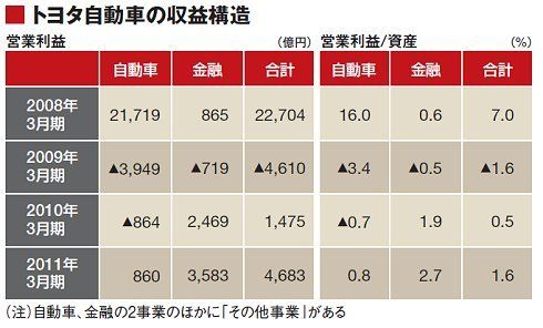 トヨタの金融事業は13兆円を超す資産を保有しており、これまでも「トヨタ銀行」ということがいわれていた。09年3月期には連結営業赤字になったものの、10年3月期においては、自動車事業が赤字を続ける半面で、金融事業は2469億円の営業利益を生み出していた。しかし09年は経済危機によって対米輸出が大きく落ち込んだ異常な年だったので、こうなるのもやむをえないと考えられたのである。