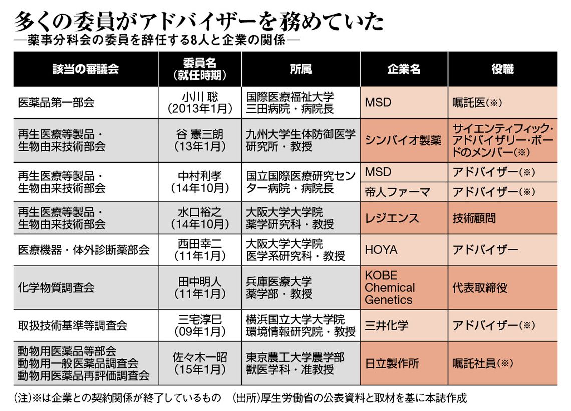 厚生労働省は6月5日、薬事・食品衛生審議会薬事分科会の委員のうち8人が、薬事に関する企業の顧問などに就き、定期的に報酬を得ていたことを公表。薬事分科会規程に反するため、8人とも辞任届を提出することになった。