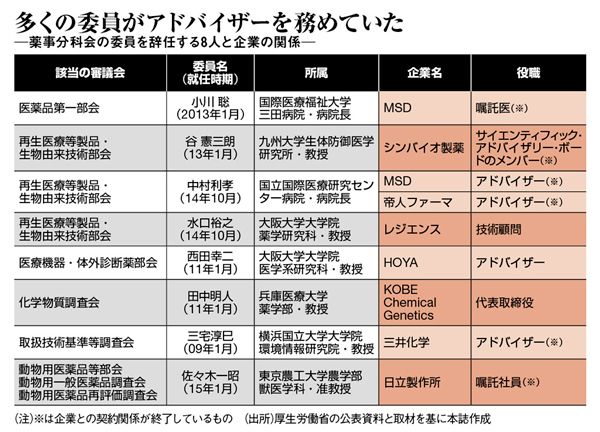 発端は今年3月に、一人の委員から企業の顧問などへの就任について報告があったこと。これを受けて厚労省が約300人の全委員に、企業との契約内容を再確認し、実態が判明した。委員の多くが新薬候補や製品に関するアドバイザー契約を結んでおり、中には企業の代表取締役を務める事例もあった。