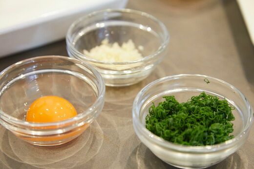 次に、にんにくをみじん切りに、万能ねぎを小口切りにしておきます。卵は今回、卵黄のみを使用するので、黄身と白身に分けておいてください。ここまでが下準備です。