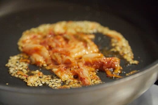 麺を茹でている間に、麺を和えるソースの用意を。まずフライパンにゴマ油、ニンニクを入れて弱火にかけます。香りが出てきたら、キムチを投入。しっかりと炒めます。
