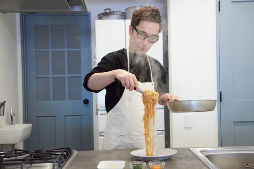 そしてすかさず麺を。一緒に炒め合わせますが、長く火にかけると麺が柔らかくなりすぎるため、1分以内くらいで手早く炒めるのがコツです。