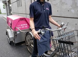 道幅の狭い繁華街エリアの中を、配達員が軽バンやリヤカーで軽々と配達先を回っていく。主な届け先は地域密着型の個人飲食店で、配達員は1時間で平均4軒を回る。午前10時の営業開始から22時まで対応している。