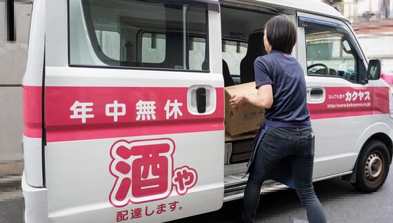大勢の人が行き交う夕方の新宿西口エリア。「なんでも酒やカクヤス」の西新宿SS(サテライト・ステーション、小型出荷倉庫)は、配達のピークを迎えていた。