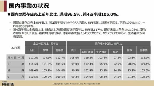 この背景には、既存店での売り上げの落ち込みがある。2023年8月期の決算説明会資料によると、「全店+EC売上」が前年比で109.4%の一方で、「既存店+EC売上」が前年比で96.5%。客数は93.2%と、漸減傾向にあるのだ。客単価の上昇と、新店および新設既存店の寄与が大きいために見えにくくなっているのだが、都市部での「無印良品」の吸引力は、明らかに弱くなっている。