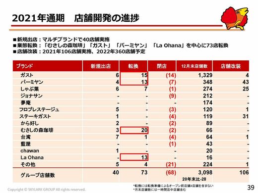 ただし、すかいらーくHD自体の業績は悪くない。毎日新聞によるインタビューで金谷実社長は「昨年は業績が急回復し、業績見込みを十分達成できた」という。特に、コロナ禍以後、「しゃぶ葉」や「むさしの森珈琲」といった業態が好調で、これらを中心に出店を加速させるという。