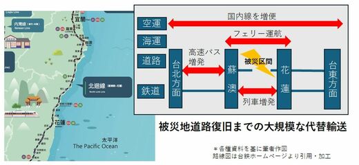 特筆すべきは自動車での移動需要も考慮し、地震翌日の4日から道路が不通となっている区間を通常は運用のない船を利用し結んだことだ。初日は蘇澳港から花蓮港の間で、乗用車を往復176台輸送、旅客は鉄道を使い移動した。