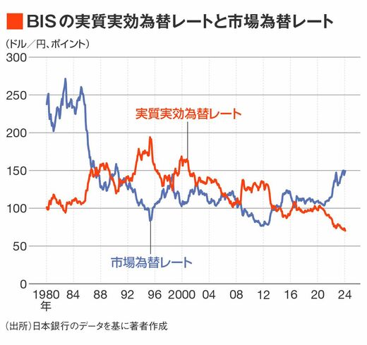 現在の日本円の市場為替レートは1990年頃の水準にまで低下したが、この頃の実質実効レートは150程度であり、現在の約2倍あった。