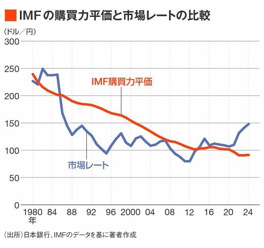 図表2に見るように、IMFの購買力平価は、1980年代の前半には、1ドル220円程度であった。その後、円高への動きが続き、現在では1ドル90円程度だ。
