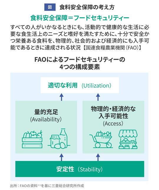 一般に食料安全保障という言葉を聞くと「有事の際に十分な食料が得られるよう備えておくこと」をイメージしがちです。しかし、国連食糧農業機関(FAO)が定めた本来の食料安全保障=フードセキュリティーとは、「いつでも」「誰でも」「栄養だけではなく文化的にも」「食生活が満たされる」ことを意味しています。つまり「有事」に備えるのはもちろんですが、「平時」においてこそ健全で文化的な食生活の実現を図ることが大切だということになります(図)。