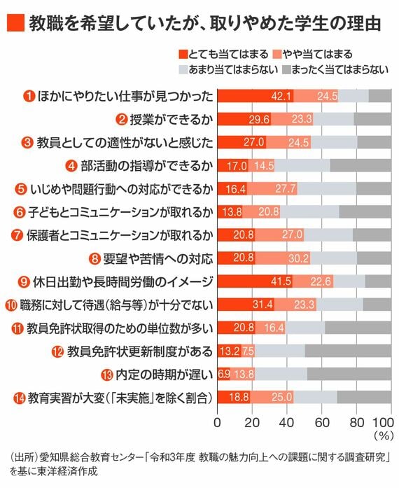 愛知県総合教育センターが愛知県内6つの大学の学生向けに実施したアンケート調査(2021年4・5月実施)では、教職を希望していたが、取りやめた理由をたずねている。「ほかにやりたい仕事が見つかった」については仕方がないとしても、とくに「休日出勤や長時間労働のイメージ」と「職務に対して待遇(給与等)が十分でない」が多い。また、「授業ができるか」や「保護者とコミュニケーションが取れるか」「要望や苦情への対応」への不安も大きい。