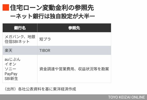 目下の焦点は、基準金利の引き上げだ。多くの銀行で変動型の基準金利は短期プライムレート(短プラ)に連動する。理論的には、日銀が利上げに踏み切れば短プラが上昇し、それを参照する住宅ローンの基準金利が上がり、適用金利も上がる。
