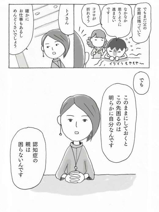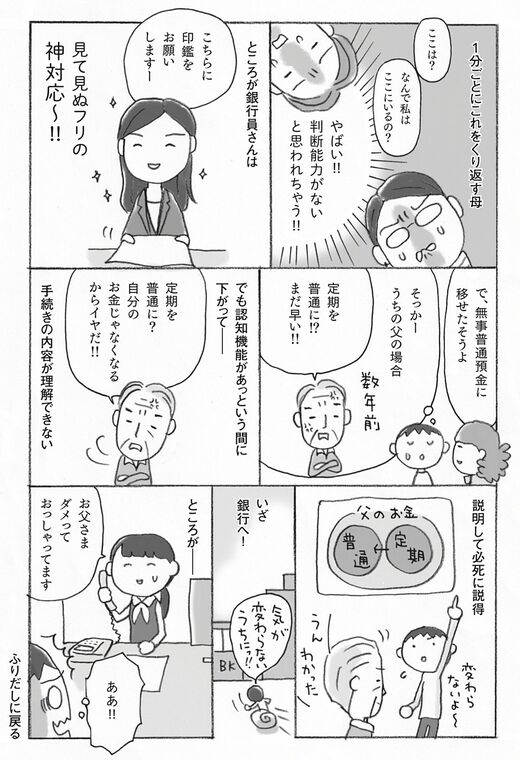 ライフ #マンガで解決 親の認知症とお金が不安です 前の記事 次の記事 親の認知症「お金を守る」ためにすぐやること 「親のお金はあるのに使えない」事態は避けたい 3分で読める 公開日時:2024/04/26 17:30 上大岡 トメ イラストレーター フォロー 黒田 尚子 ファイナンシャルプランナー フォロー 1/5 PAGES 2/5 PAGES 3/5 PAGES ©上大岡トメ・杉山孝博・黒田尚子/主婦の友社 子どもの負担にならないように ©上大岡トメ・杉山孝博・黒田尚子/主婦の友社 次ページが続きます 4/5 PAGES 5/5 PAGES