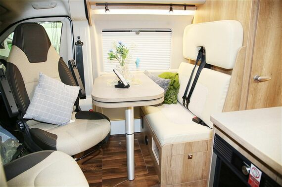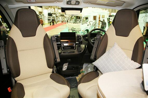 乗車定員4名、就寝人数2名を確保するのがこのタイプ。車体左側にあるスライドドアを開けると、天井高1900mmを確保する広々とした室内が広がる(天井高は3タイプ共に同じ)。エントランス右には、ガラス蓋付きシンクを採用するキッチン。シンク用の家具には電子レンジや70Lの冷蔵庫も備えるほか、キッチン上方の家庭用エアコンも標準装備だ。また、通路を挟んで右側にあるセカンドシートの前にはテーブルも設定。停車時に運転席と助手席を後ろへ180度回転させれば、大人4名がくつろげるダイネット(リビング)となる。