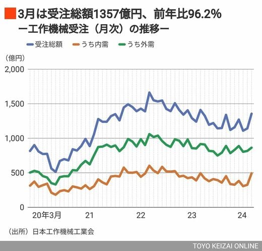 2024年3月の受注総額は、1356.5億円。前月比でプラス18.8%、前年同月比でマイナス3.8%という結果になった。年度末の駆け込み受注によるものが大きいが、2023年9月以来の1300億円超えとなった。