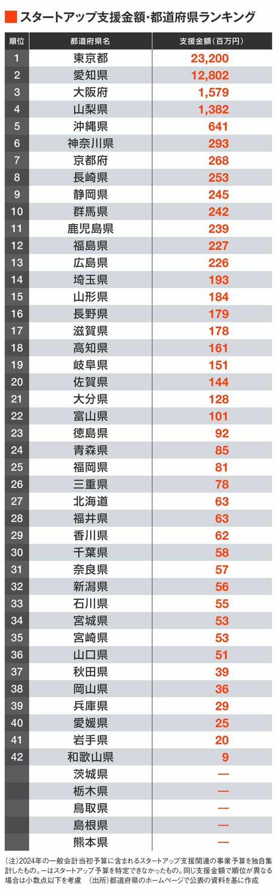 政治・経済・投資 スタートアップ支援が手厚い都道府県ランキング 一般会計当初予算に含まれる事業予算を集計 4分で読める 公開日時:2024/04/30 05:30 東洋経済オンライン編集部 フォロー 1/5 PAGES 2/5 PAGES 3/5 PAGES 【2024年5月1日15時40分追記】初出時、上記で神奈川県の支援金額に誤りがありました。お詫びして図表を修正いたします。神奈川県は6位となります。 次ページが続きます 4/5 PAGES 5/5 PAGES