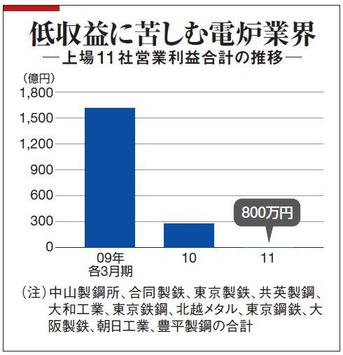 が、理由はそれだけではない。実は、震災以前から再編が起こるのは時間の問題とみられていた。構造的な不況によって、電炉メーカーの利益が急激に落ち込んでいるからだ(図)。