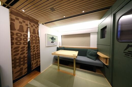 車内に足を踏み入れると、1・3号車の畳個室は水戸岡氏が得意としたデザインを想起させるが、ほかの部分では、水戸岡氏が手がけた車両にしばしば搭載されていた大川組子のような装飾物は見当たらない。ソファの生地もシンプルで水戸岡デザインの車両でよく見られる意匠はない。1号車のソファ席や3号車のボックス席はシティホテルのラウンジのようなイメージだ。