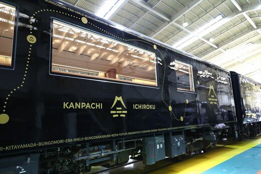 黒い外観はこれまでの水戸岡デザインを踏襲しているようにも見えるが、違いはある。たとえば、「ふたつ星4047」には先頭車両のてっぺんに2つ重ねた星形のマークが載せられているなど凝りに凝った装飾が細部に至るまで施されているが、「かんぱち・いちろく」はこうした装飾がなくすっきりとしている。