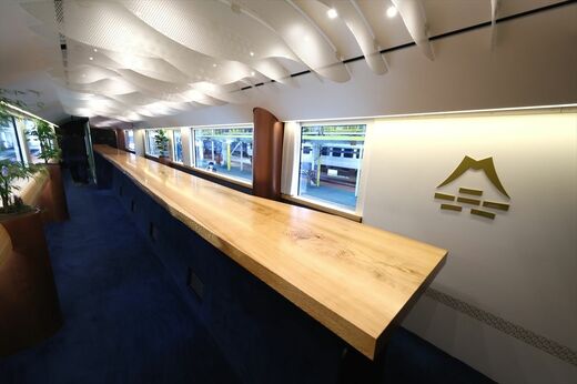 そして、この列車の最大の売りが2号車。樹齢約250年の杉を使った長さ約8mの一枚板カウンター。共用スペースのラウンジとして使用され、ビュッフェとしても使われる。