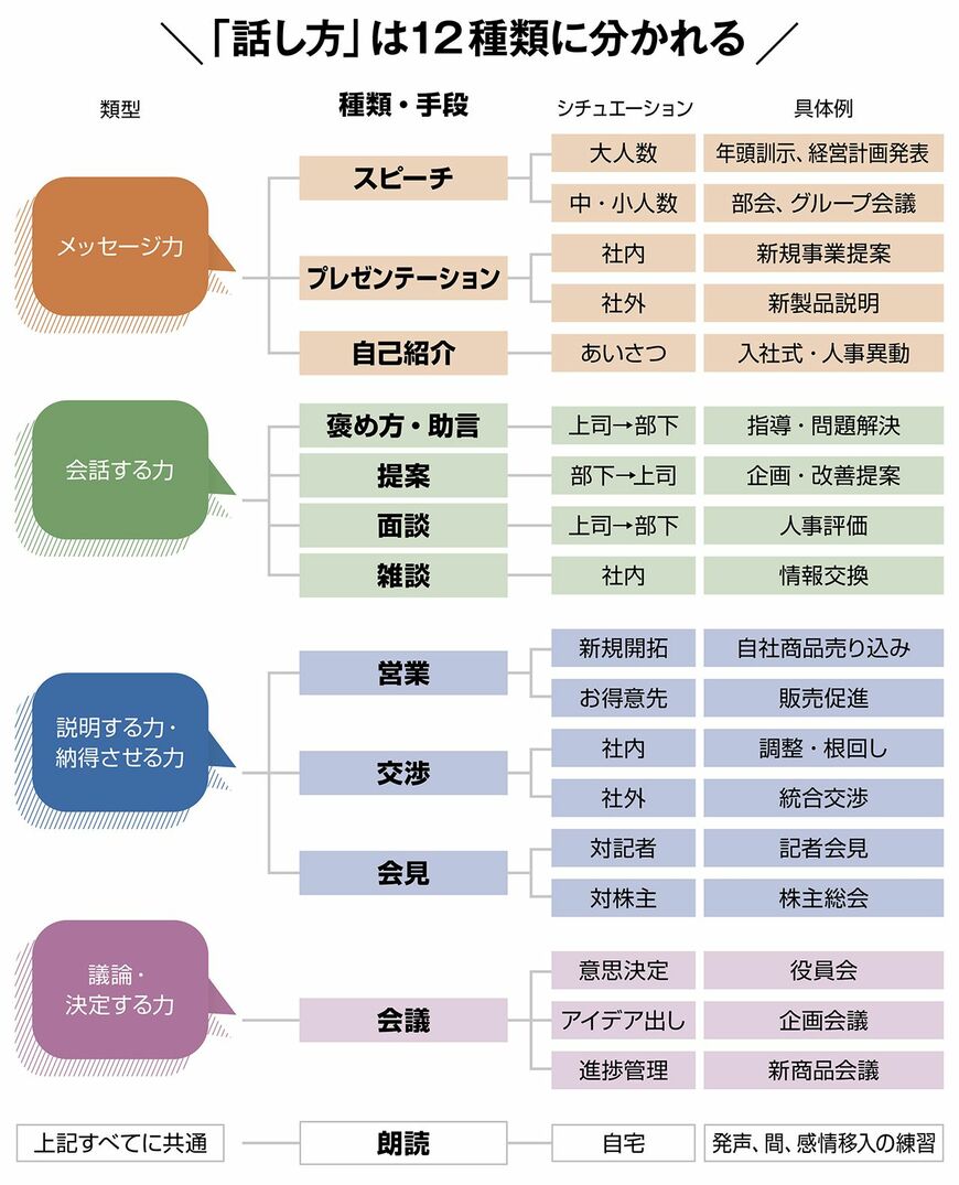 また、話し方次第で、ビジネスの成否が変わるということもよくある話だ。相手に伝わる話し方を身につければ、プレゼンや営業、会議などでの訴求力は格段に上がる。