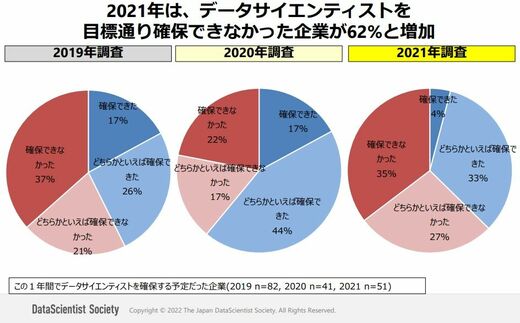 データサイエンス人材を必要とする企業は増えているものの、会社が必要とするスキルを持ち合わせている人が不足しているという声も。自社の仕事に合う人となるとさらに難しくなるため、採用はなかなか難しいようだ。