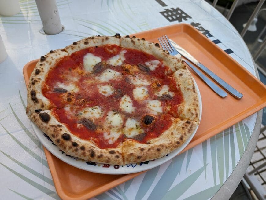 おとなしく、添えられていたナイフとフォークで食べるのがベターなようだ。トマトの甘みを感じるソースと、惜しみなくのせられたアンチョビの塩気がマッチしている。見た目だけでなく、味も非常に本格派のピザである。