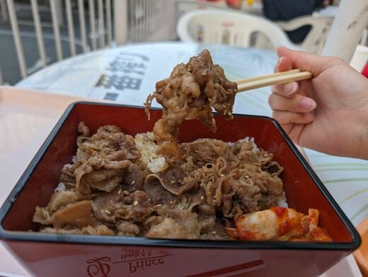 いよいよ真打ちの焼肉重を実食。見た目は牛丼風だが、牛丼とは違って玉ねぎが入っていない、牛肉一本勝負。脂身の硬さなどは全くなく、肉の風味と脂のうま味、やや甘辛めの味付けでご飯が進む。隅にある紅一点、キムチも単に酸味や辛味を感じるような単純なものでなく、本格派の風味がある。
