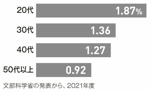 2021年度に心の病で休職または1カ月以上の休暇をとった教職員の、在職者に占める割合。年代別に見ると、20代が最多だった(出所:『何が教師を壊すのか 追いつめられる先生たちのリアル』)