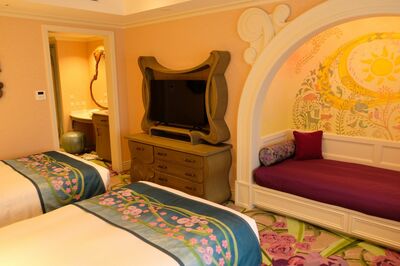 高級棟のグランドシャトーに比べると、通常棟といえるのが「ファンタジーシャトー」。こちらは419の客室を有している。通常棟とはいえ宿泊料金は、ほかのディズニーホテルと同程度の1泊6万3500円からだ。