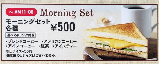 「カフェ・ベローチェ」のモーニング提供時間は開店から朝11時まで。AセットからCセットまで3種類の調理パンとドリンクのセットです。筆者が利用した店舗での販売価格はいずれも税込500円でした(公式ホームページには税込480円〜と記載、店舗により商品価格が一部異なる)。
